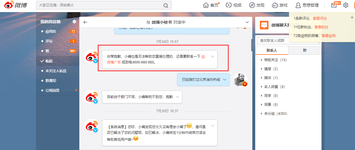 1、投诉新浪微博诱导消费、误导消费、涉嫌欺诈。 我在新浪微博中写了文章,提交的时候,通知我说“非粉丝需关注作者后阅读全文(可提升粉丝量)”。等我提交完毕之后,选购了“粉丝头条”进行推广,试推期间,发现1000元能带来540个左右的粉丝;于是我用同样的逻辑付费10000进行推广,然后发现一个奇怪的现象,在刚刚开始的时候,粉丝增长还可以,但是刚过了一会儿,就只见阅读量不断攀升,而不太见粉丝增长了,我感觉非常奇怪,就问了评论我微博的人,我问:您是否先关注我,然后才能阅读全文的?对方回复说:不用关注你就可以阅读全文啊! 我于是和微博小秘书进行沟通,沟通中得知,微博粉丝超过两万的时候,会自动取消这一限制,也就是说当你的粉丝超过两万之后,其他粉丝就不再需要先关注你然后才能阅读全文了,而我在付费期间的粉丝数量,恰好卡在两万粉丝的点上。得知这个信息,我马上询问:你们是否有公开说明这个规定,并反复、多次要过这一规定的公开声明,但是很遗憾,微博小秘书回复说没有对外公布这一规定! 也就是说我作为消费者,花钱之前,新浪微博告诉我说用户必须先关注我之后才能阅读;我付费之后,新浪微博却未经过我同意,单方面更改了策略(这一策略完全没有对外公布!我看完了他们的服务规定,也没有发现有相关的规定进行公开声明!),让用户不需要关注我即可阅读全文。也就是新浪微博没有按照我的意愿进行的进行推广,完全违背了我的付费意愿,严重涉嫌诱导消费、误导消费、涉嫌欺诈! 比这个更令人愤慨的是新浪商业服务的态度!多次电话给他们,总是推诿给其他部门,让我打电话给4000960960,但是4000960960却反馈给我说:我的这个投诉的审核权和退费权都在商业服务部门;微博小秘书、微博客服也反复多次告诉我说让我找微博商业服务部门,但是很令人寒心的是:@微博广告却不作为,今天竟然收到一条他们的短信,告知我说:无法办理退款,理由竟然是奇葩的:“粉丝头条与涨粉无必然联系”!拜托,我的投诉理由是:“新浪微博违背我的推广意愿,单方面取消先关注后阅读的功能,导致不是按照我的推广意愿进行的推广,严重涉嫌诱导消费、误导消费、涉嫌欺诈。” 2、新浪微博单方面取消我站内和 @微博小秘书、 @微博客服的 人工转接,严重侵犯我的权益; 3、新浪微博单方面提出我大量微博进入到相关话题及其热门的排序,严重影响了我的权益。 新浪微博两个部门想尽千方百计的相互推诿,电话分别如下: