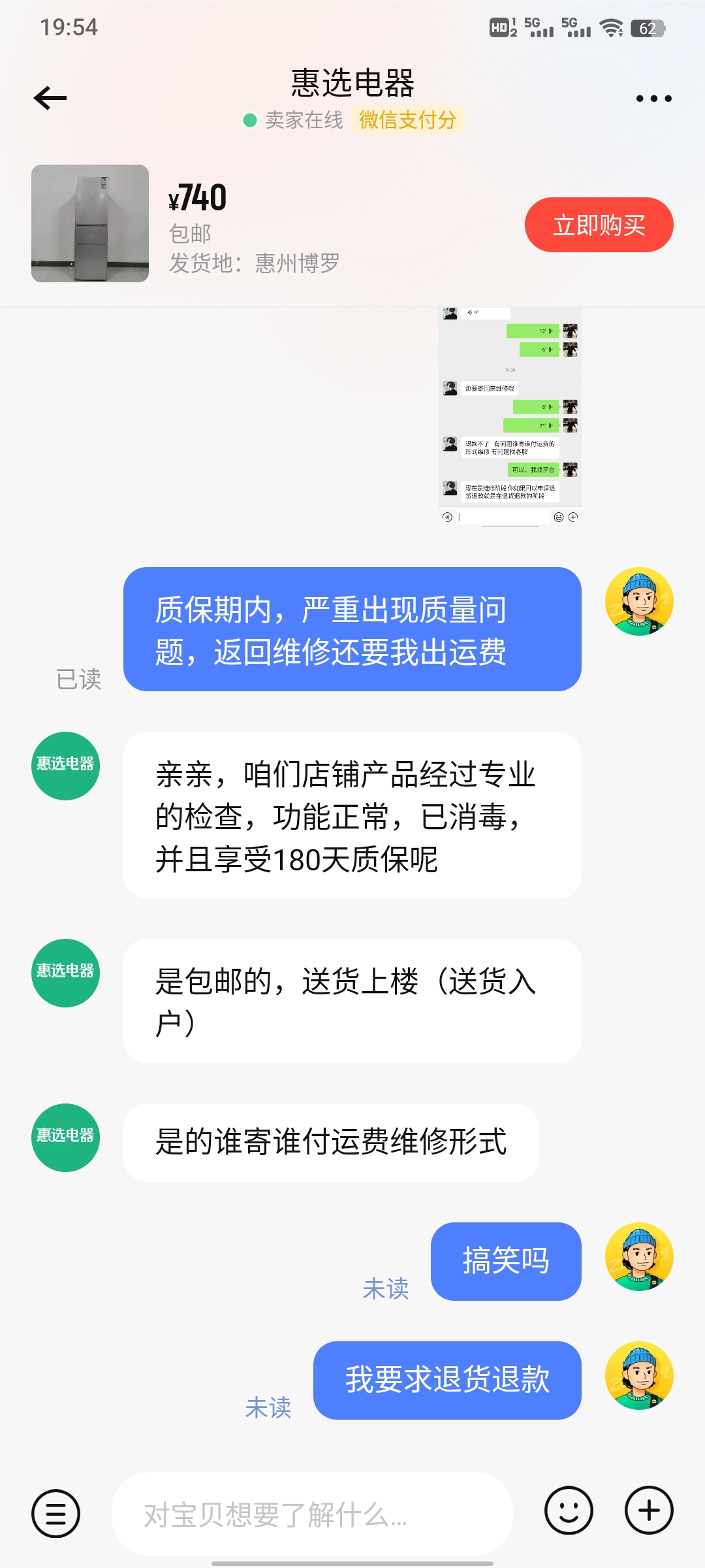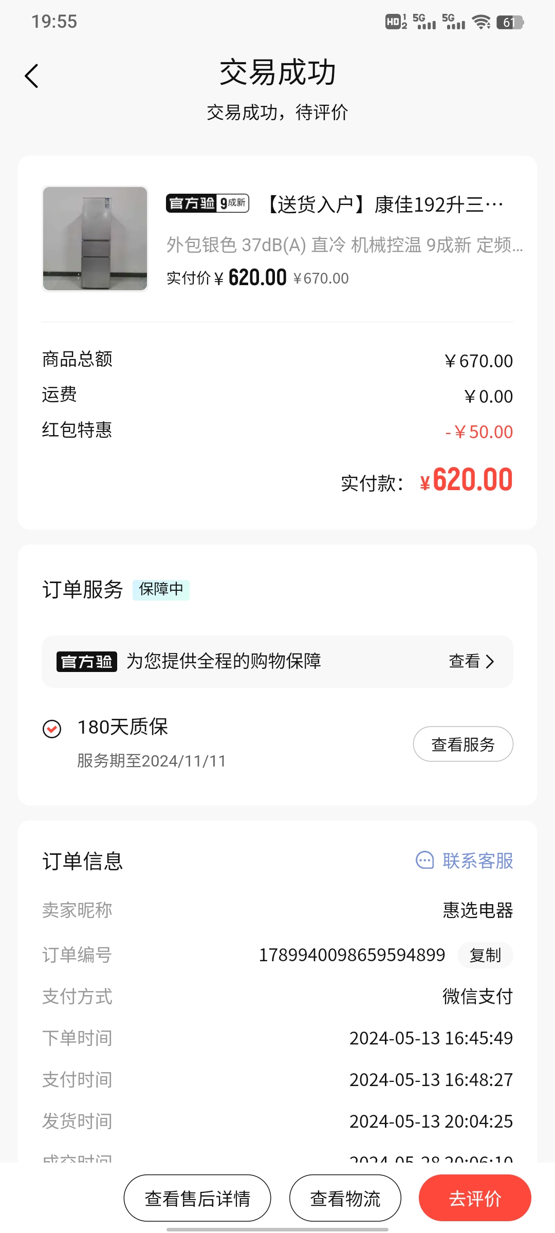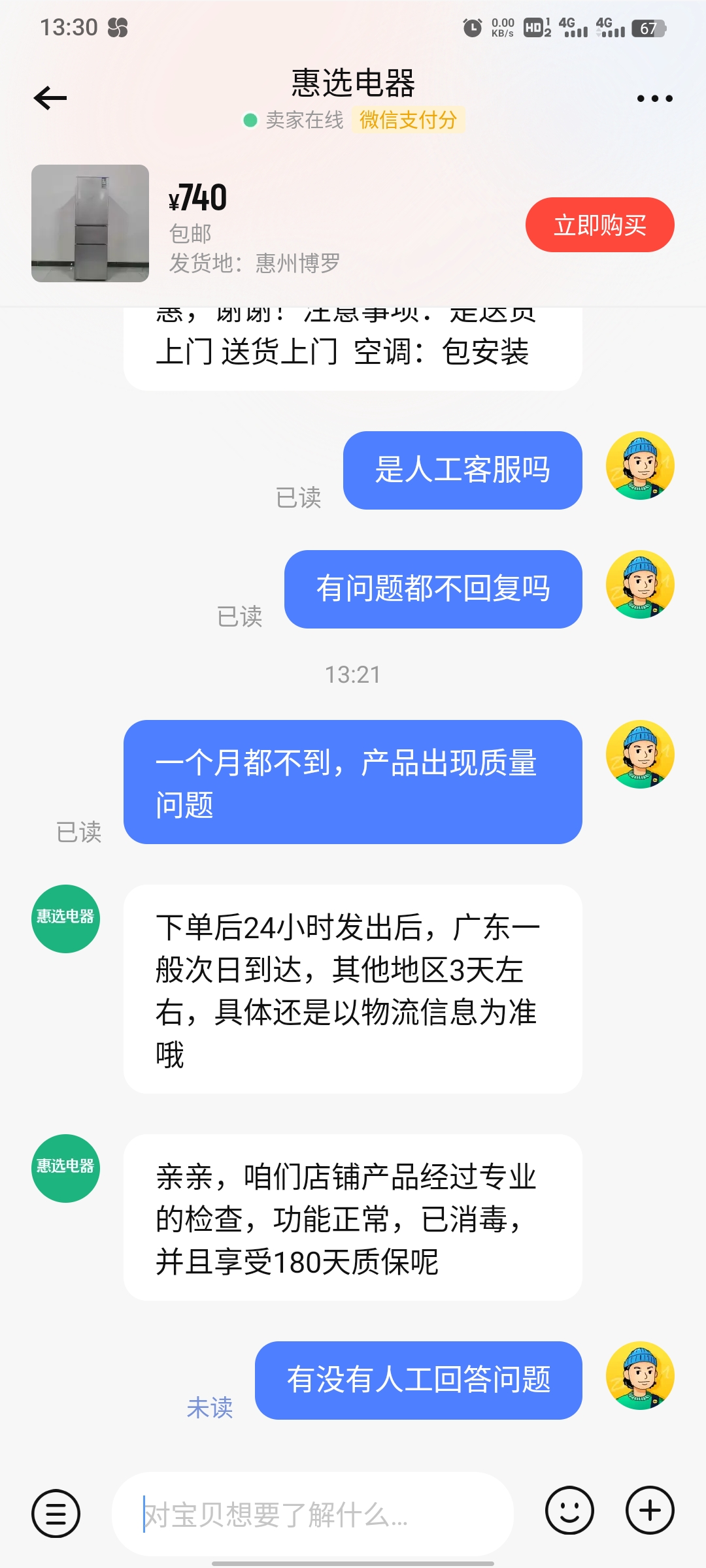2024年5月13日从转转平台购买了一台描述为康佳9成新的冰箱,收到货后,发与描述严重不符,内部有破损补胶两处,外部磕碰凹凸不平明显,找商家,不回复,后来使用正常也就算了,中途使用有漏水问题,至2024年6月1日,冰箱有烧焦味,无法启动,多次插电跳闸,后投诉卖家,才给回复,说让他推荐的维修人员微信看看,联系维修人员后,回复不专业,要跟客服协商,联系客服,说让寄回维修,买家承担运费。使用不到半个月,就出现严重质量问题,还是涉及用电安全问题,这样的监管及售后,无法接受。 转转平台客服与昨天给我回复,解决方案是平台可以我补贴两百元的运费,超出部分我自行承担,我联系快递公司,需要380元的运费,我不接受,平台客服说向领导及商家反馈协商,我当时为了不想再纠纷了,就说我做出让步,让他们做出300元的赔偿,机器这样也没有修的必要,我就当买个教训,不再相信这个平台。到今天下午一个工号2978的客服给我回复,给出的解决方案还是平台补贴200元的运费或者线下维修费,超出部分要我自行承担,我不接受。商家质量出现严重质量问题,而且在报修期,无视消费者保护权益法。不承担相应的责任售后,平台作为监管部门,没有起到相应的监管责任,对消费者的合理售后问题,处理草草,谁还能相信这个平台。我要求原价赔偿。现在平台直接不处理我的投诉单,私自完结