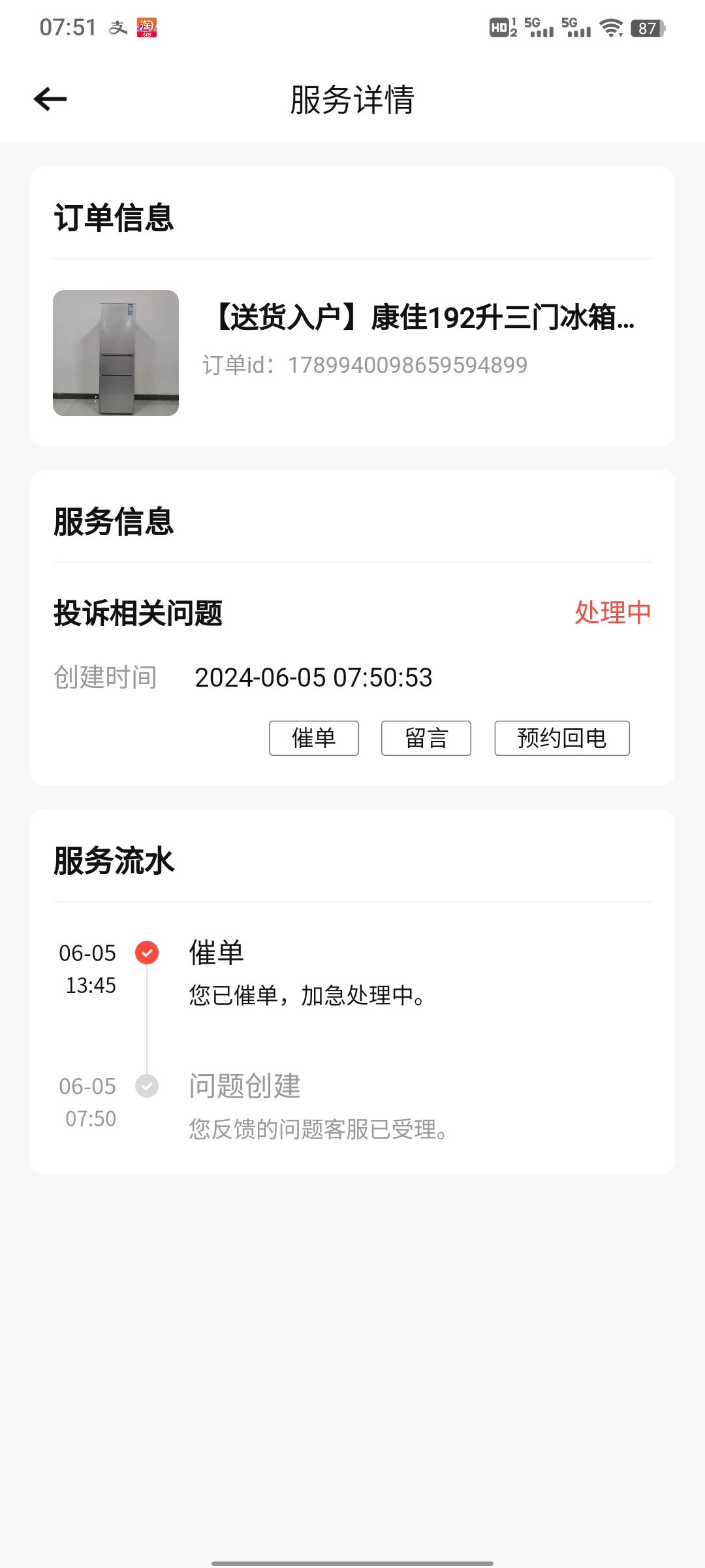 投诉进度:投诉发布——>商家处理——>商家回复——>投诉解决