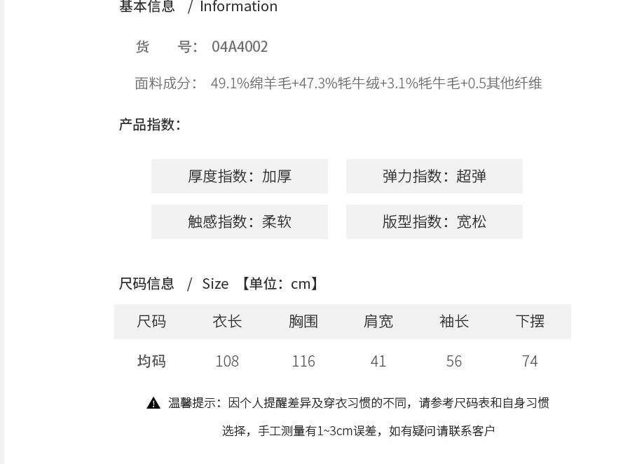 1 本人于2023年11月12日,在1688平台上的嘉兴金色年华针织科技股份有限公司店铺购买了一件大衣,牦牛绒长款针织外套大衣 货号04A4002,价格327元,有网上交易凭证。 2 收到快递后,发现服装长度不够,与网页商品描述相差较大,量尺寸后发现有11公分的差距,第一时间联系商家客服,客服以本店不支持七天无理由退换货为由,拒不退货,我完全不认可,这明显是产品质量问题,并不是我无理由的不要商品了才退货。 3 我的投诉诉求是1,商家必须退货并承担运费;2,对商家滥用交易条款销售不合格产品行为进行查处。3,交易平台1688对“七天无理由退换”的解释中包含因质量问题等也算是无理由之一,明显袒护商家,损害消费者权益,因当整改。