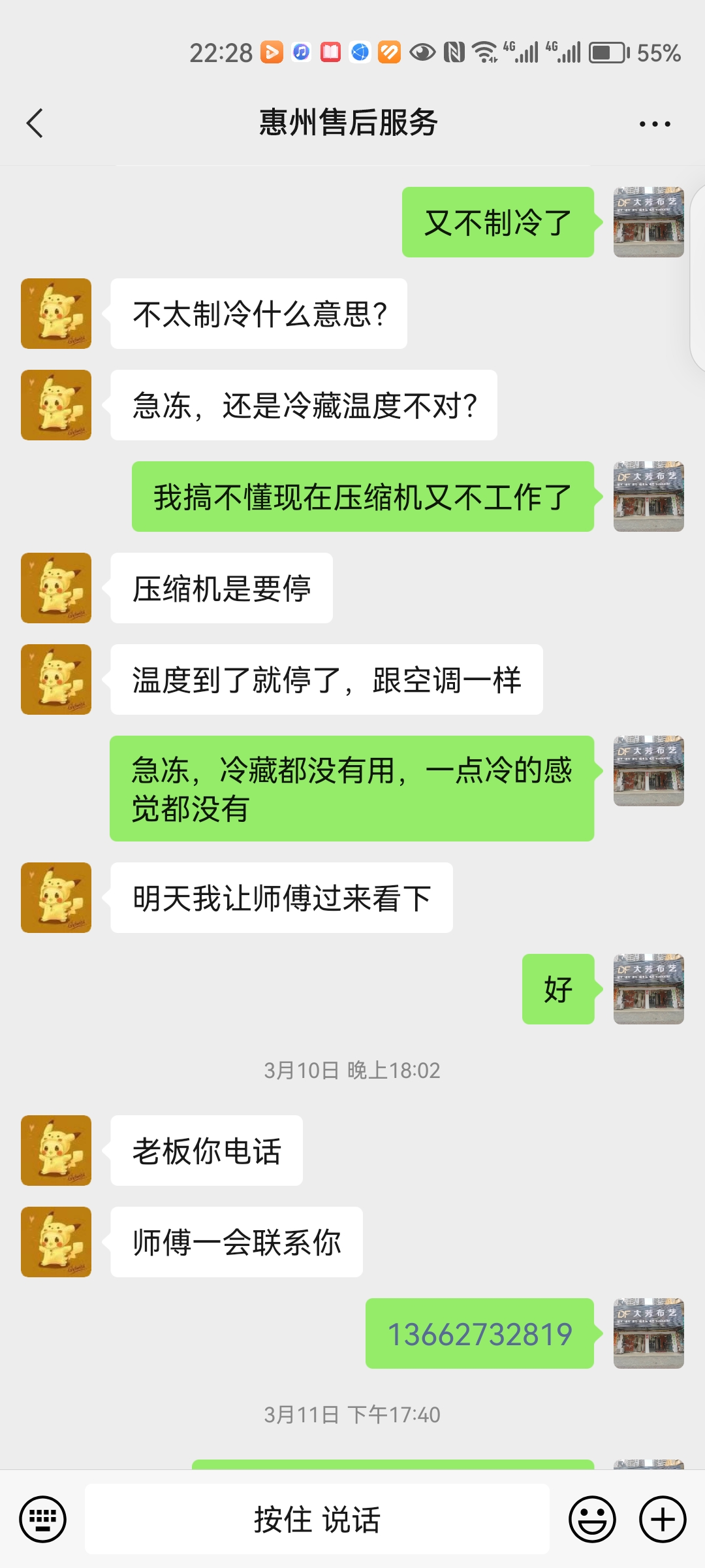 1、2020年8月13日,本人通过京东平台购买了美菱冰箱1台,金额2699元。 2、2023年1月26日发现出现冰箱不制冷。 3、2023年1月27日联系经销商售后服务人员,按排了师傅上门处理,冰箱拉回维修点维修,一个星期左右拉来用了一个月左右,2023年3月7日又出现冰箱不制冷。 4、第二次联系售后人员一个星期都没有人来处理,2023年3月16日来了售后维修师傅太不专业了敷衍了事看了几眼,上门维修工具都不带齐全,又没有修好了,冰箱质量太差了,售后也不及时。