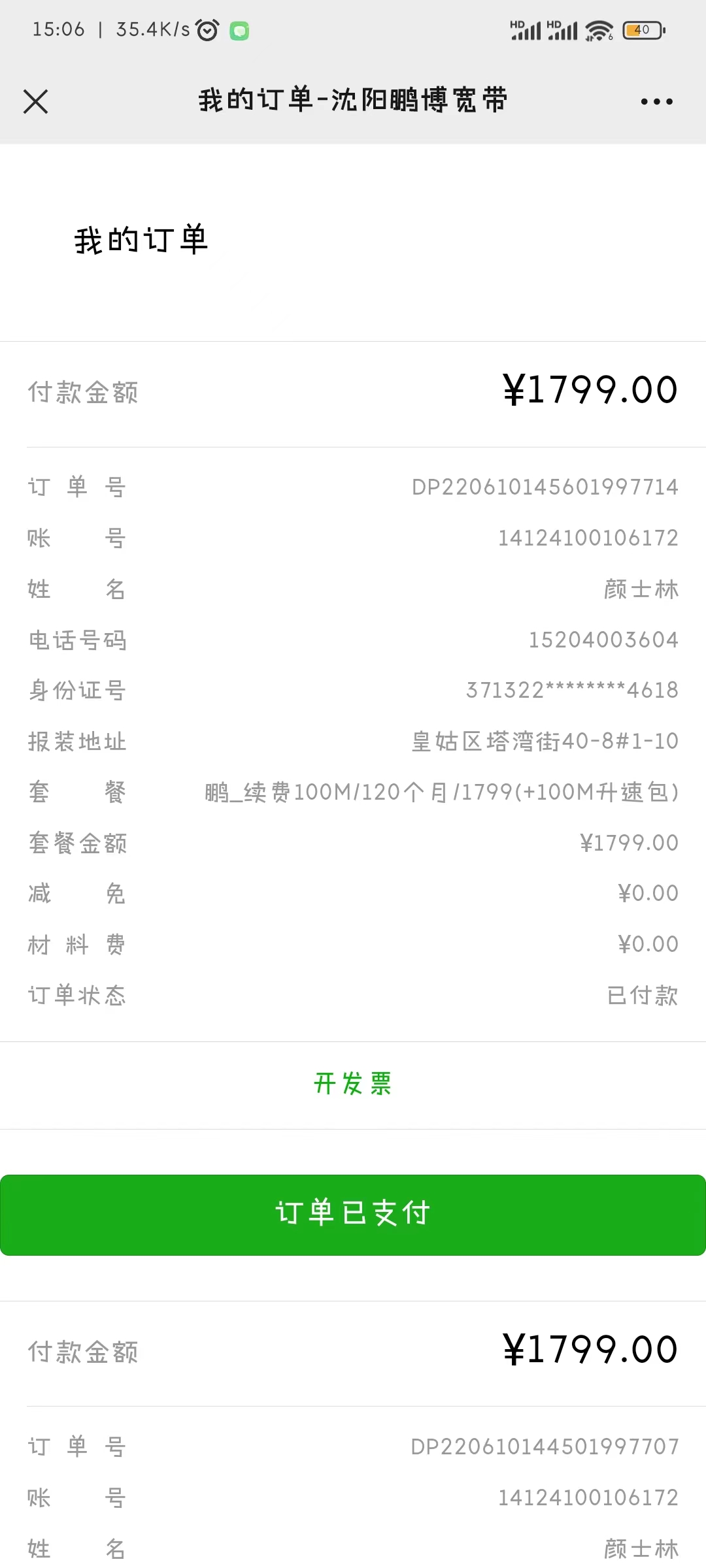 1、2022年6月10日,本人通过沈阳鹏博士微信公众号购买100M/120个月宽带产品,价格共计1799元,已于2022年6月10日全款支付,对方未开具发票。 2、2023年1月27日,使用宽度的7个多月期间,网络多次卡顿、断网,无法正常使用。 3、在此期间我多次联系鹏博宽带工作人员,对方以网络波动、对接端口,过几天就会好的理由答复,但问题始终未得到正式解决,因此我联系工作人员退费。 4、2023年1月30日,本人前往位于沈阳市皇姑区步云山路26巷2号1门的鹏博宽带服务站进行退费登记,现场提交了身份证、银行卡、订单号等信息,工作人员承诺6个月内进行退款,且已停止宽带服务。 5、截止到2024年5月5日,本人仍未收到鹏博宽度的退款,期间十余次拨打客服电话询问退款进度,客服人员均以帮忙催促的话术推脱。 6、我的投诉诉求是:要求鹏博宽带在7天内进行退款。