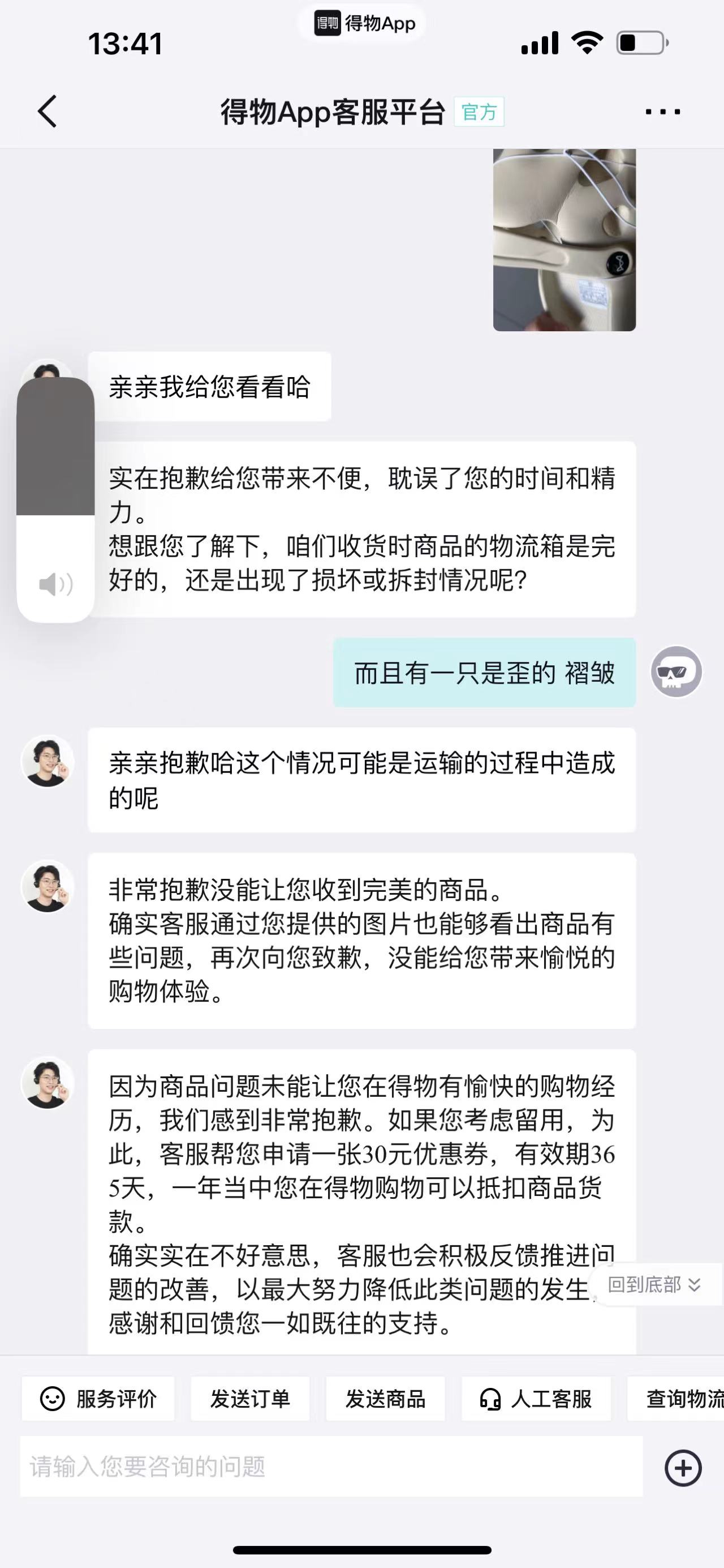 于得物2024年3月4日在得物APP购买拖鞋,商品宣传页面明显标注购买赠送随机卡扣十个,3月8日鞋子到了没有附赠卡扣,鞋子有褶皱痕迹,联系得物APP工作人员说赠送我一张30元的得物APP消费卷,我没同意,结果得物工作人员和上海市消费者保障协会介入,介入结果是虽然我在得物APP上购买,但是是由我买的鞋子品牌方直发,他们管不着。让我自行联系厂家。最终不了了之,现在得物APP下架此商品。