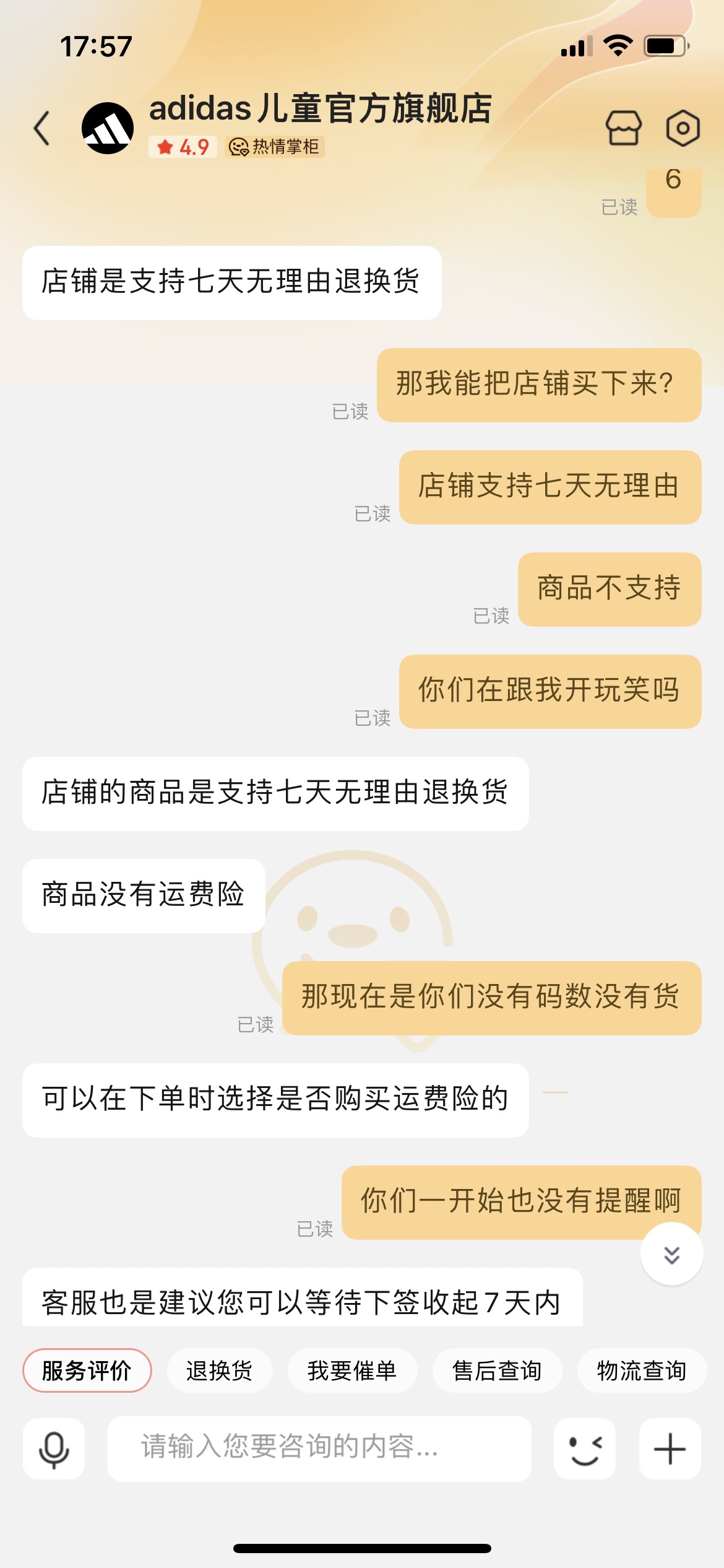 2024年1月27号,本人在Adidas儿童官方旗舰店买了双鞋子,购买的时候我发链接给客服,询问码数不合适可不可以退换货,客服回应收到商品不合适商品完整完好无脏污店铺支持七天无理由退换货 ,并没有告知我退换货不包运费险,快递几天在2024年1月31日到了,发现不合适,要换货,客服说没有码数了,那我就直接退货,他说不包含运费险。并无告知七天无理由属于非店铺原因的 退货或者换货 寄回商家运费需要您自行承担。现在客服跟我扯,店铺支持七天无理由退换货,商品不支持。而后改口说商品支持,但是需要自己购买运费险。属于欺骗消费者权益,并无尽到告知消费者运费险不包的责任。