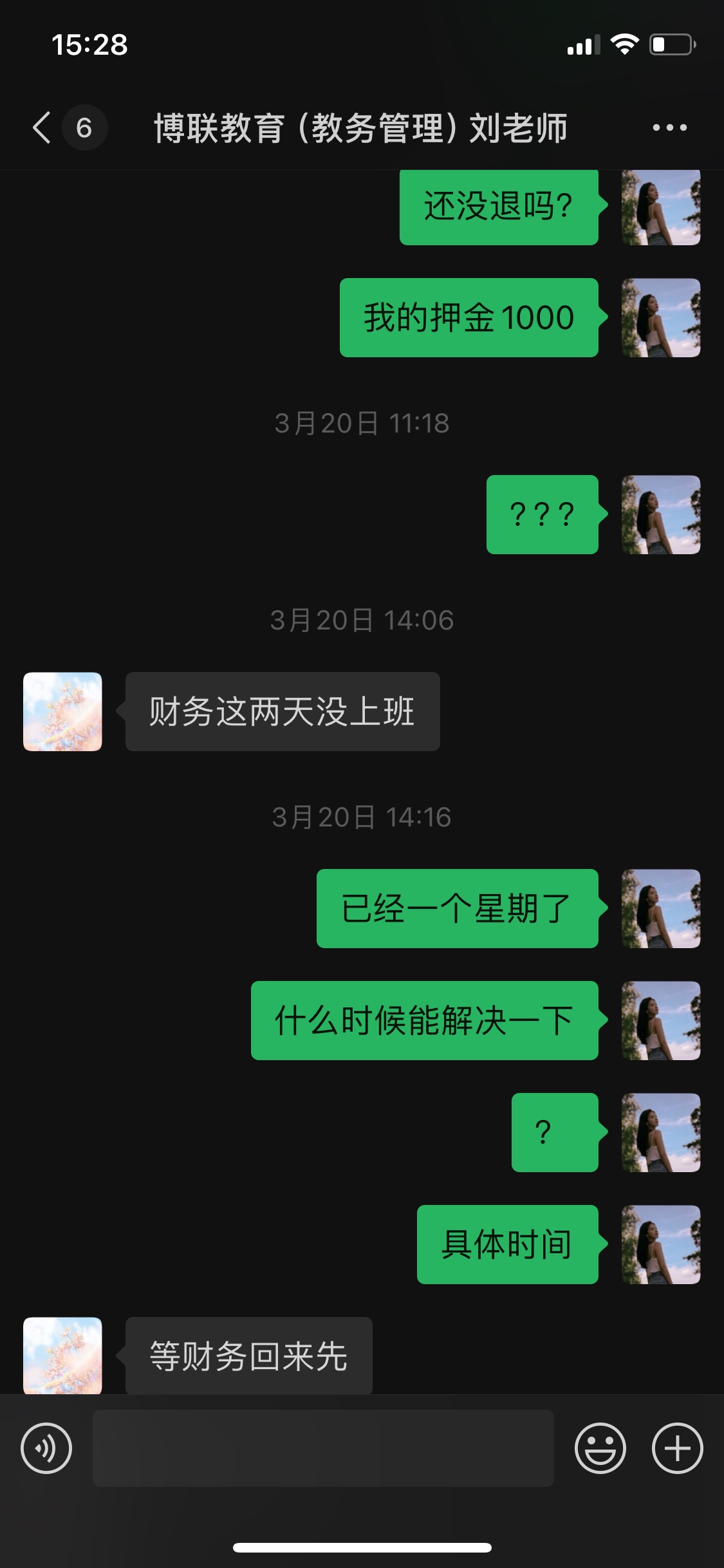1、在广州市博联教育咨询有限公司报考成人大专学费合计,6900元/3年,本人2021年6月5日缴费了教育机构的活动是付款610抵学费,2021年11月22日支付了第一年学费2300元,2023年3月10支付了第二年学费2300元,2024年3月13日支付了第三年学费2300元,教务老师说支付了学费之后返还押金1000元,已多次联系迟迟没有返回。教务老师微信号:ZYLSY131419