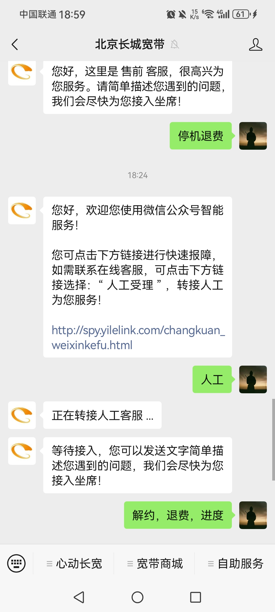 本人在2023年12月6日在长城宽带官网续费了长城宽带套餐,并于2024年5月8日因住所变动申请移机服务,客服回应新地址无法覆盖,经联通营业厅沟通申请解约退款,自5月11日以来多次电话、网络联系客服人员,均已各种理由推脱退费,目前已无法联系客服人员