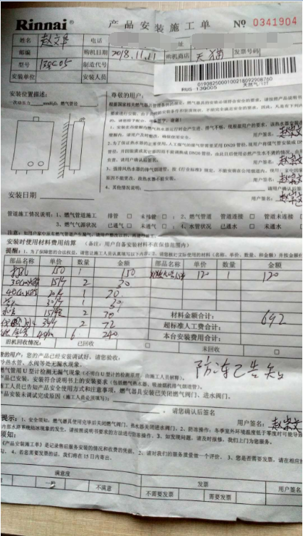 1,2018年11月11日,本人通过天猫购买了林内官方旗舰店的燃气热水器,共计一个,产品型号为Rinnai/林内 JSQ26-C05 13升,价格共计3349.00,对方出具发票。订单号: 258776897266556557,日日顺物流运单号:6194862556。 2,2018年12月15日,林内售后过来安装,但是安装收费过高,收费表上面收费692,安装师傅说还有2个阀门需要收费150,现在没货,需要到货以后安装,安装费用总计842,安装收费过高。 3,2018年12月15日,我联系了林内天猫客服,说明问题,客服并未给出明确答复。 4,安装所收费用,远远高于市场辅料费用,要求杭州阿米巴电子商务有限公司给出合理补偿,并作出解释。
