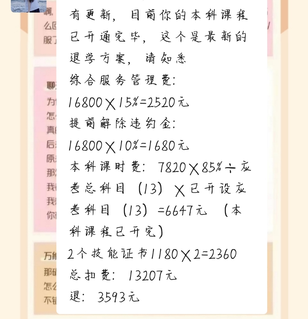 1、本人于2021年10月26日,通过微信及电话的方式,在广州成学文化科技有限公司承诺解决本人高中毕业证,及送三个职业技能证书的情况下,在对方公司推荐的海尔云贷公众号,引诱本人贷款16800元购买该公司的业务培训(成考大专、自考本科),由于本人工作原因,报名付款后一直未参加 2、2023年8月7日,本人报考成考大专时发现该公司不能解决本人高中毕业证,且职业技能证书也需收费1180元一个,这对与对本人付款前的承诺不符,本人提出退费 3、经过本人与该公司的多次沟通,仍未解决问题,据本人所了解该公司的 业务培训范围并不包含职业技能证书的培训也不包含教育类经营许可范围,对方刚开始愿意退6660.6元,现在只愿退3593元,由于与本人所支付金额差异太大,本人不能接受 4、望相关部门人员协助调查,帮我退费并解除合同